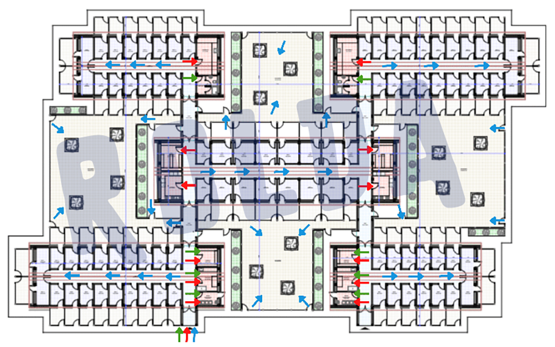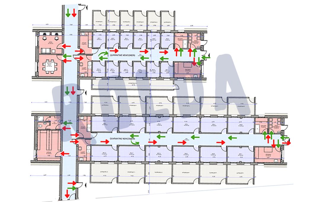Zonele marcate cu albastru, verde și roșu sunt cele unde este permis accesul ● vizitatorilor, ● volunatarilor, și ● al angajatilor.