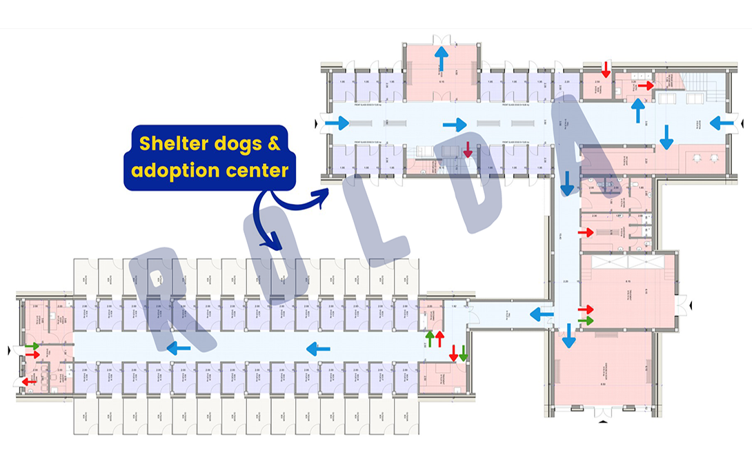 Suprafață totală: 3,445 m2 care cuprind o zonă de adopții, adăpost pentru câini, spațiu de carantină, spațiu pentru boli infecțioase și adăposturi suplimentare pentru câini